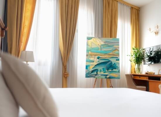 Una habitación doble, espaciosa y elegante, con vistas al canal. La vista del agua y de las góndolas que pasan es hipnótica.